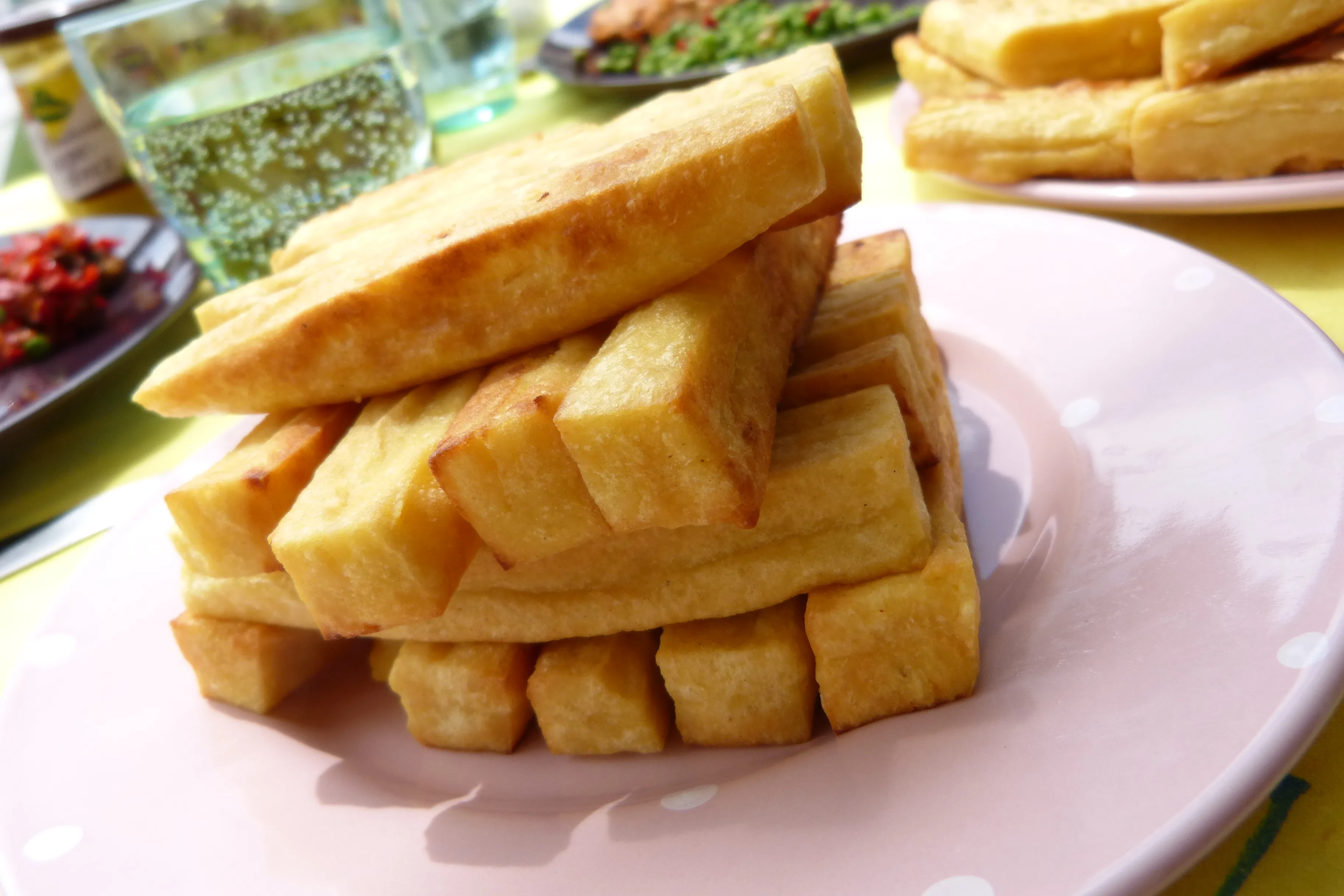 Lorsque la pâte est bien figée, taillez-la en petits disques, en frites ou en cubes.